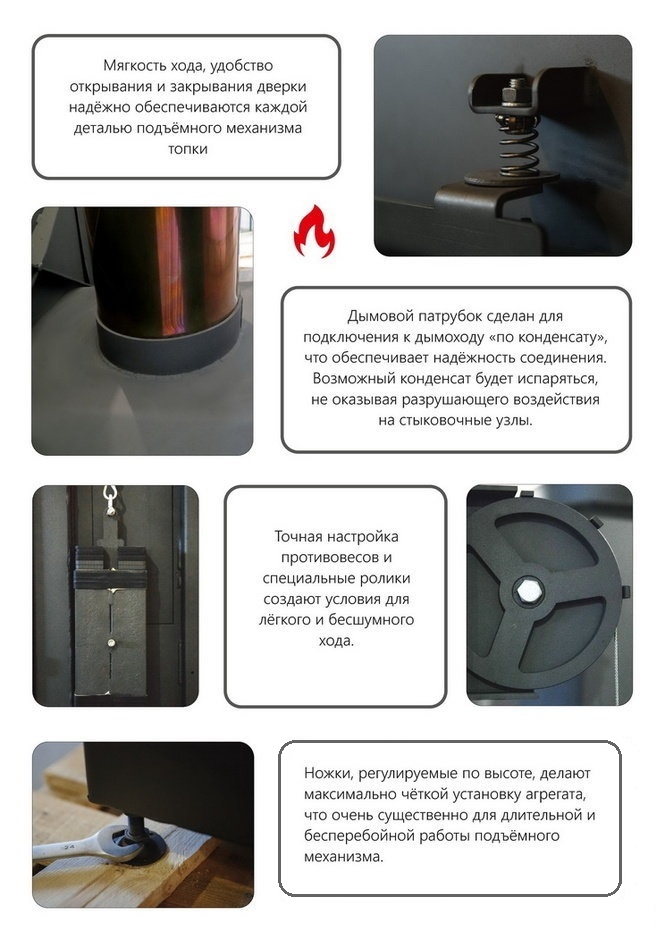 - Герметичность топки гарантируют специальные направляющие и качественные уплотнители.
